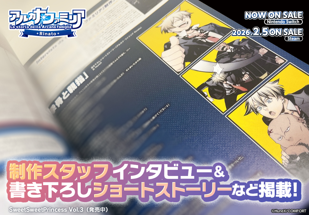 12月27日に発売された SweetSweetPrincess Vol.3 にてNintendo Switch『アルカナ・ファミリア Rinato』のプレイレポ&書き下ろしSS「拳骨と親指」&開発者インタビューが掲載されました! リベルタ&ダンテを中心としたファミリーのいつもの空気を感じられる日常系ショートストーリーです。
